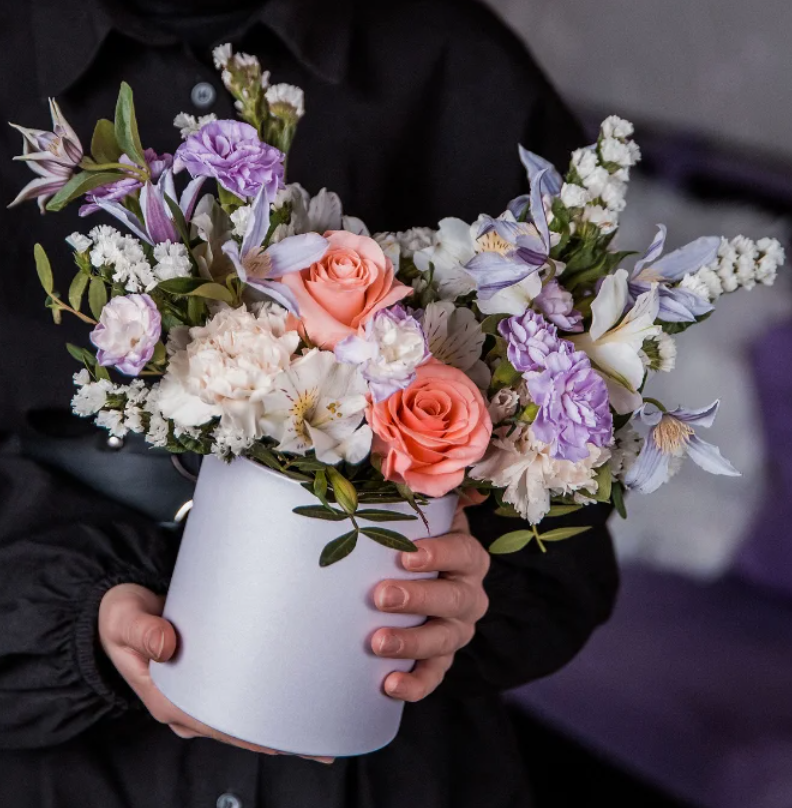 A delicate arrangement with soft white roses, baby’s breath, and crystal-like accents.